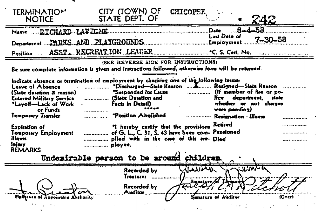 As far as we know, Lavigne began abusing boys as a teenager, getting fired from a summer job at 17 after he molested a six-year-old. His termination notice for that incident is shown below (“Undesirable person to be around children”), as well as witness statements from both the child (as an adult) and his mother: